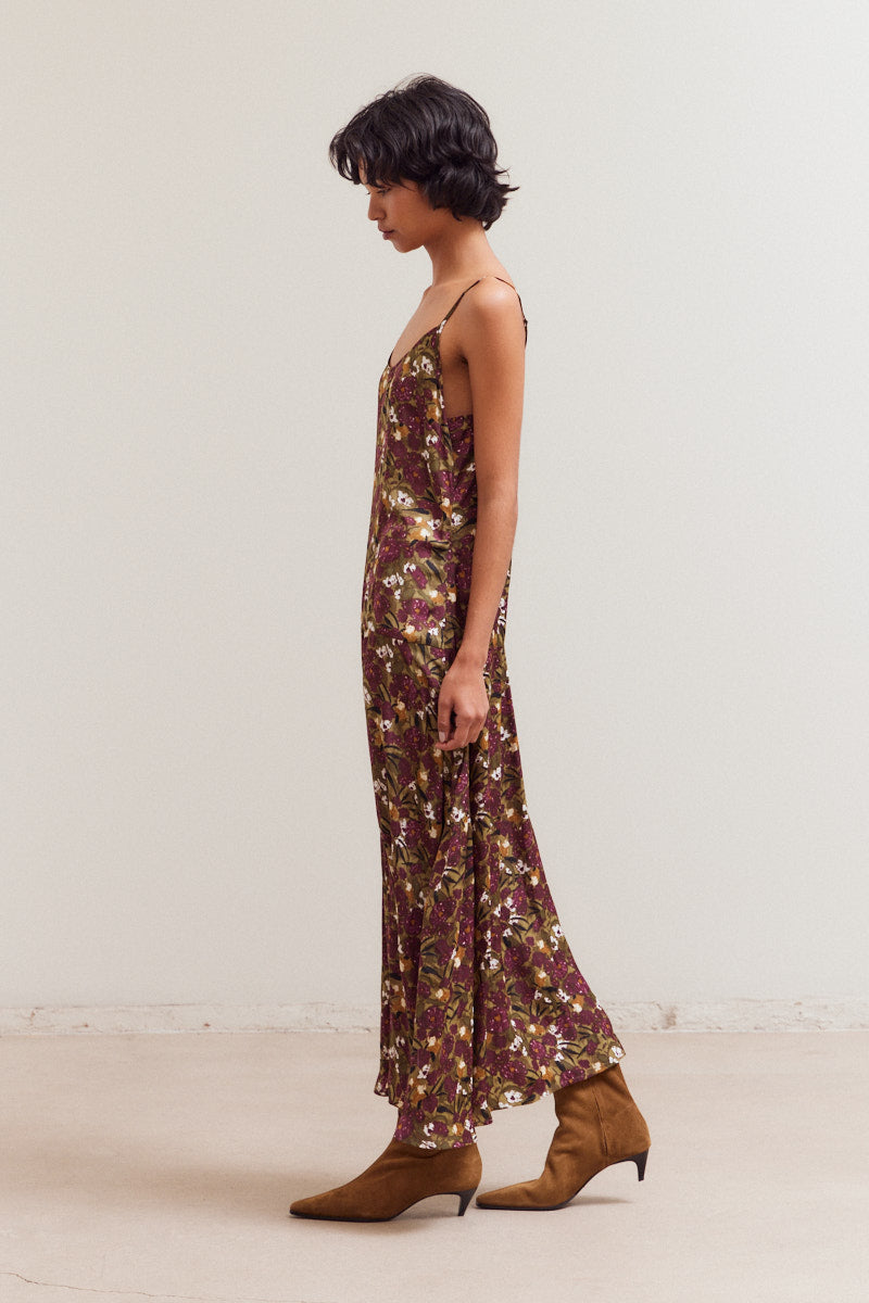 The Aura Dress captures the effortless romance of fall with its earthy floral print and timeless silhouette. Crafted from a soft, fluid fabric, this midi-length slip dress drapes beautifully and moves with ease. Adjustable spaghetti straps and a flattering scoop neckline lend a feminine touch, while the rich blend of golden, olive, and burgundy tones make it a true seasonal standout.