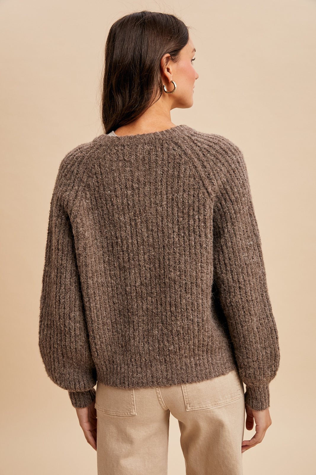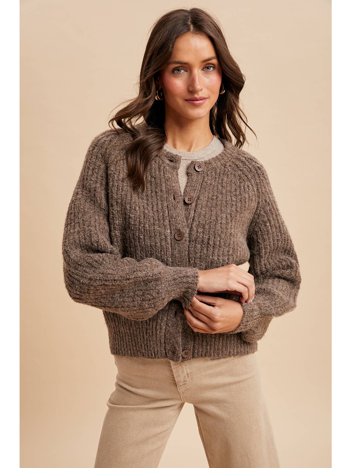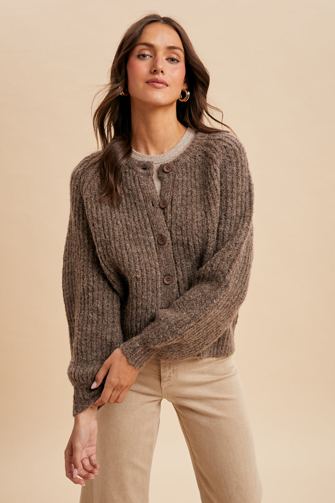Cozy meets refined in this textured knit cardigan, designed in a rich mocha hue that layers effortlessly with your fall wardrobe. The soft, ribbed fabric drapes with ease, while the relaxed silhouette and dropped shoulders create a laid-back yet elevated look. Finished with tonal buttons and a slightly cropped length, it’s perfect for pairing with high-rise denim or layering over dresses. Whether you’re headed to brunch or curling up fireside, this versatile piece is a season-long favorite.