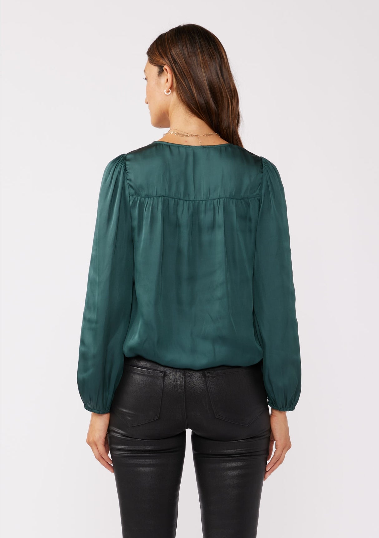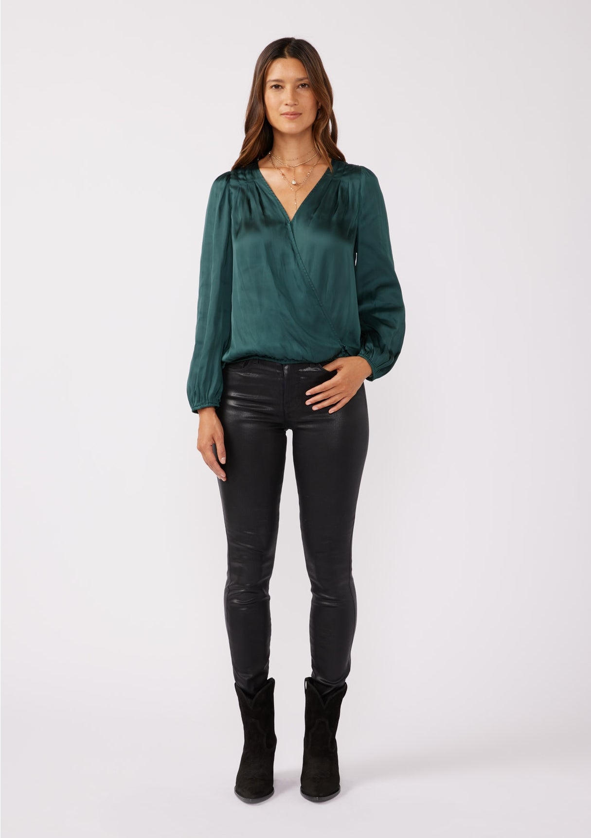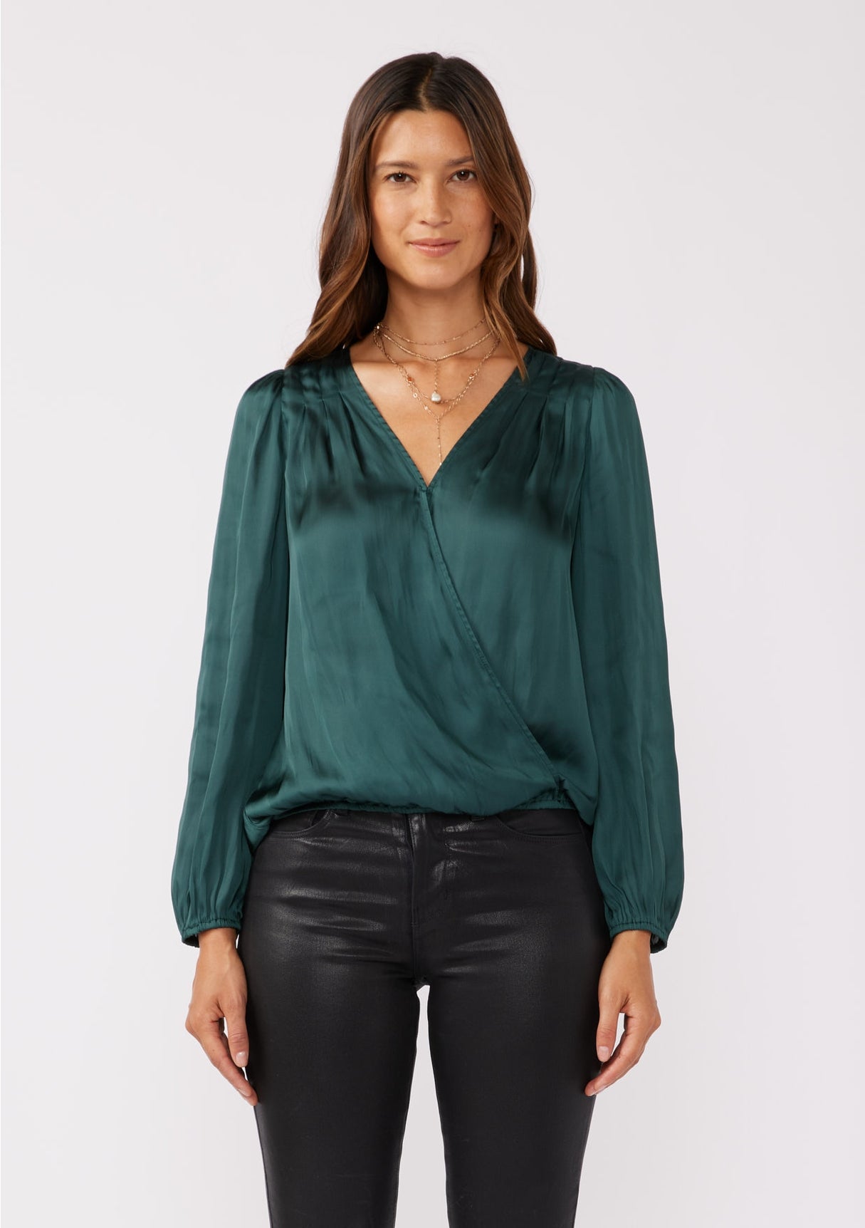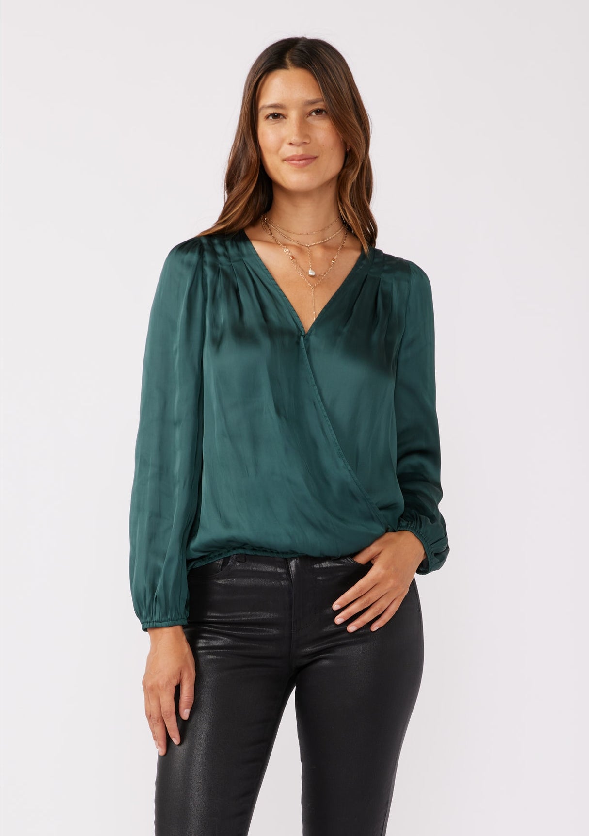 Elevate your wardrobe with the Emerald Eve Blouse, a timeless piece that brings effortless sophistication to any look. Crafted from a silky satin fabric with a subtle sheen, this wrap-style blouse features a flattering surplice neckline and softly gathered shoulders for a touch of feminine drape. The long sleeves finish with elastic cuffs, adding just the right amount of polish and ease. Perfect for pairing with denim or sleek trousers, it’s a stunning choice for holiday dinners, date nights, or evenings out.