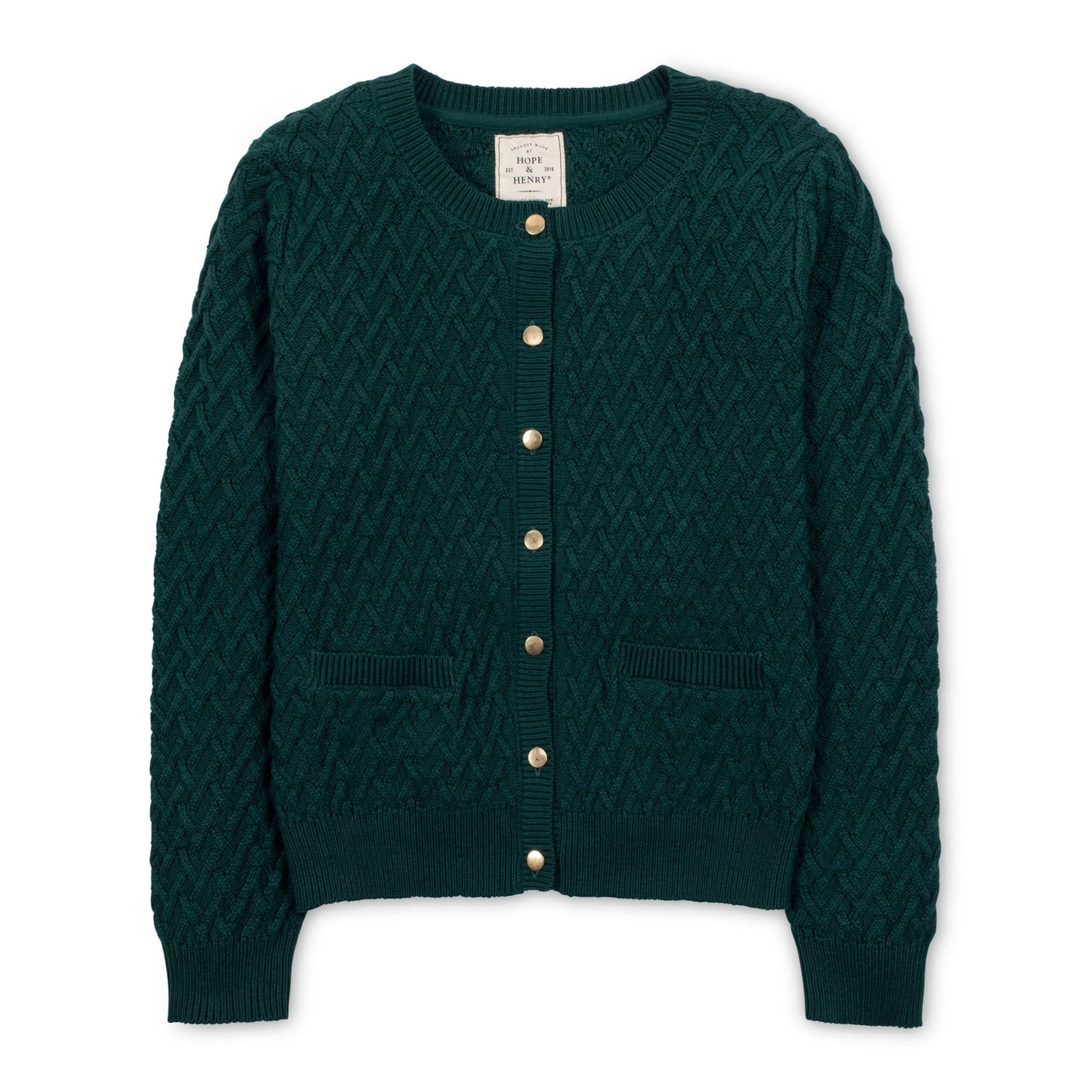 The intricate knit pattern adds depth and dimension, while the rich emerald hue brings a touch of understated elegance. Finished with gold button details and functional front pockets, it’s a versatile layer that transitions effortlessly from weekday polish to weekend coziness. A conscious choice for both style and sustainability, this cardigan is a wardrobe staple you’ll wear for years to come.