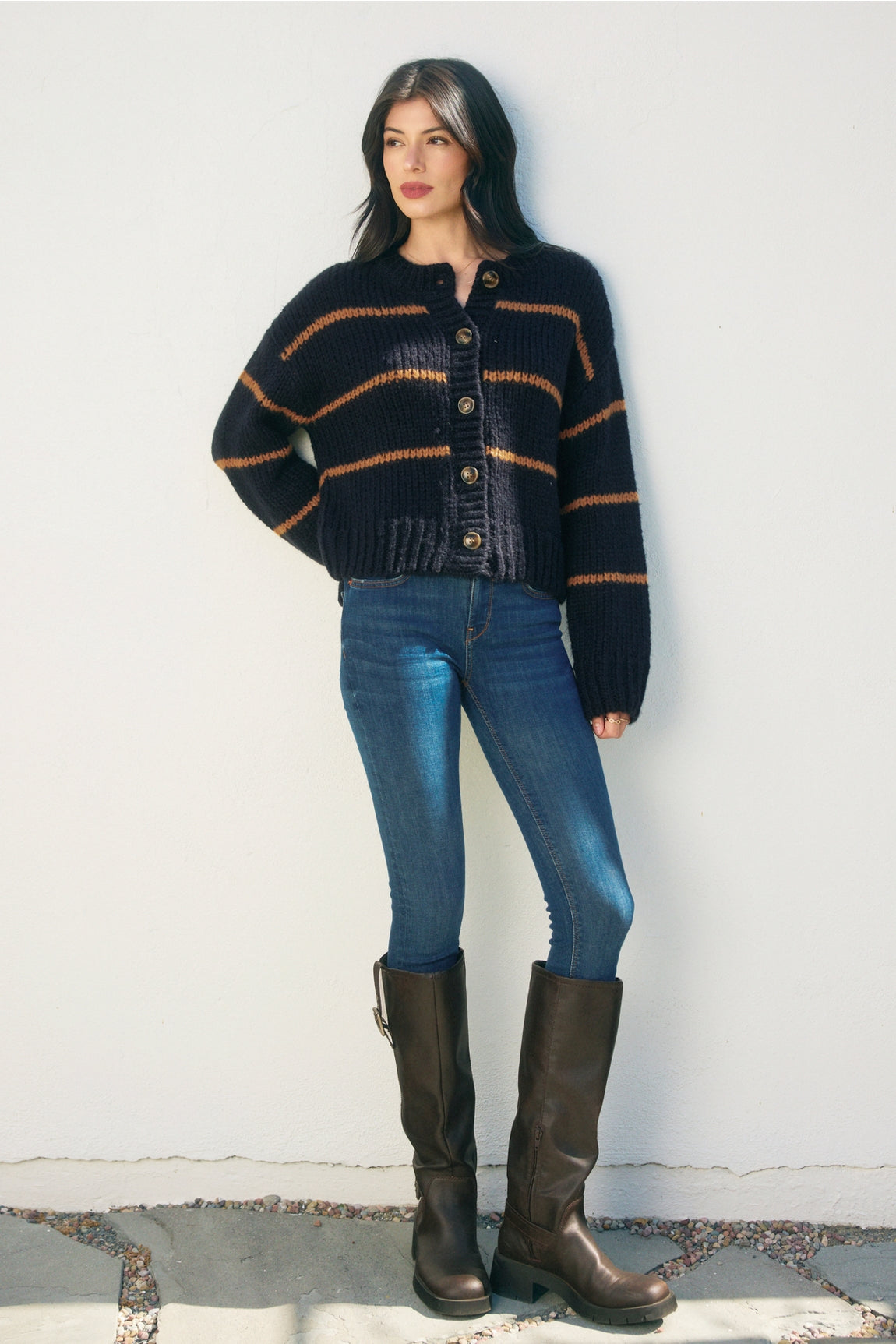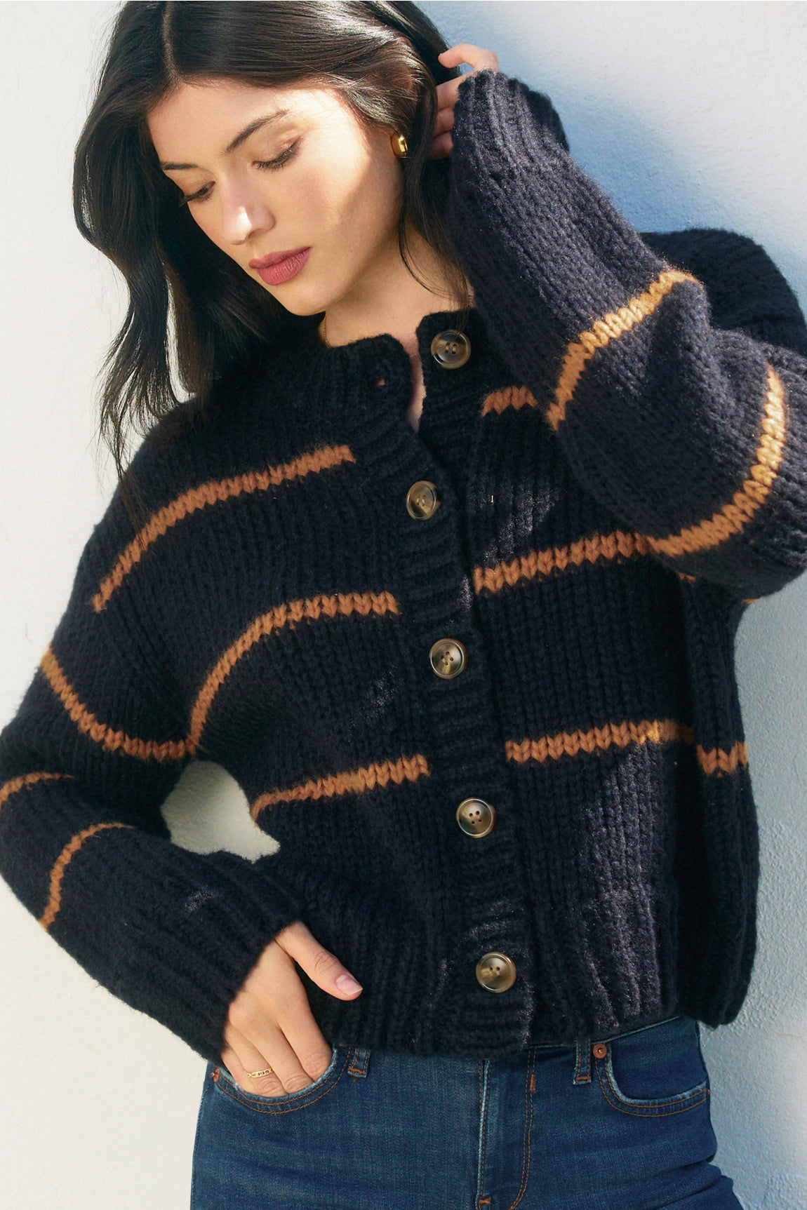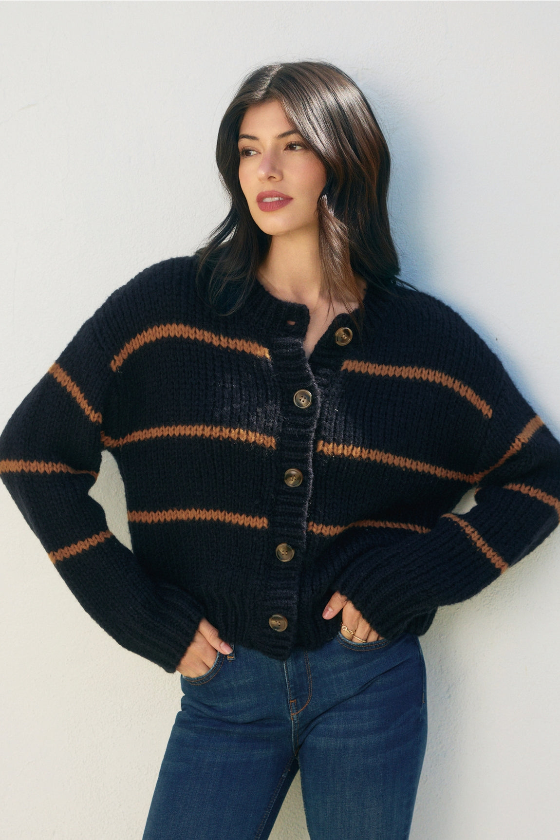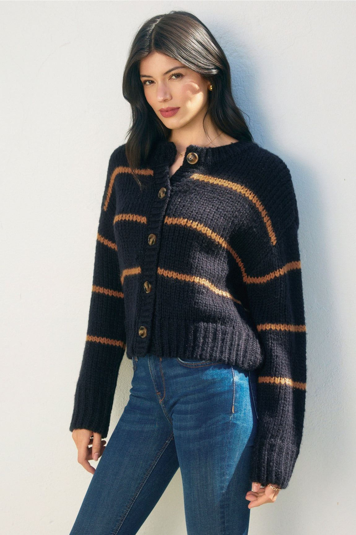 The Clara Cardgian embodies the cozy charm of the cooler seasons. Featuring soft, neutral tones with navy stripes, this chunky knit feels both classic and inviting. Its soft texture, relaxed silhouette, and statement buttons make it a go-to for fireside evenings or crisp morning strolls. Style it with denim or layered over a dress for an effortlessly timeless fall-to-winter look.