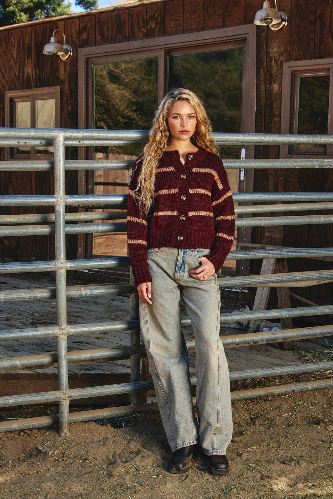 The Clara Cardgian embodies the cozy charm of the cooler seasons. Featuring deep burgundy tones with warm tan stripes, this chunky knit feels both classic and inviting. Its soft texture, relaxed silhouette, and statement buttons make it a go-to for fireside evenings or crisp morning strolls. Style it with denim or layered over a dress for an effortlessly timeless fall-to-winter look.