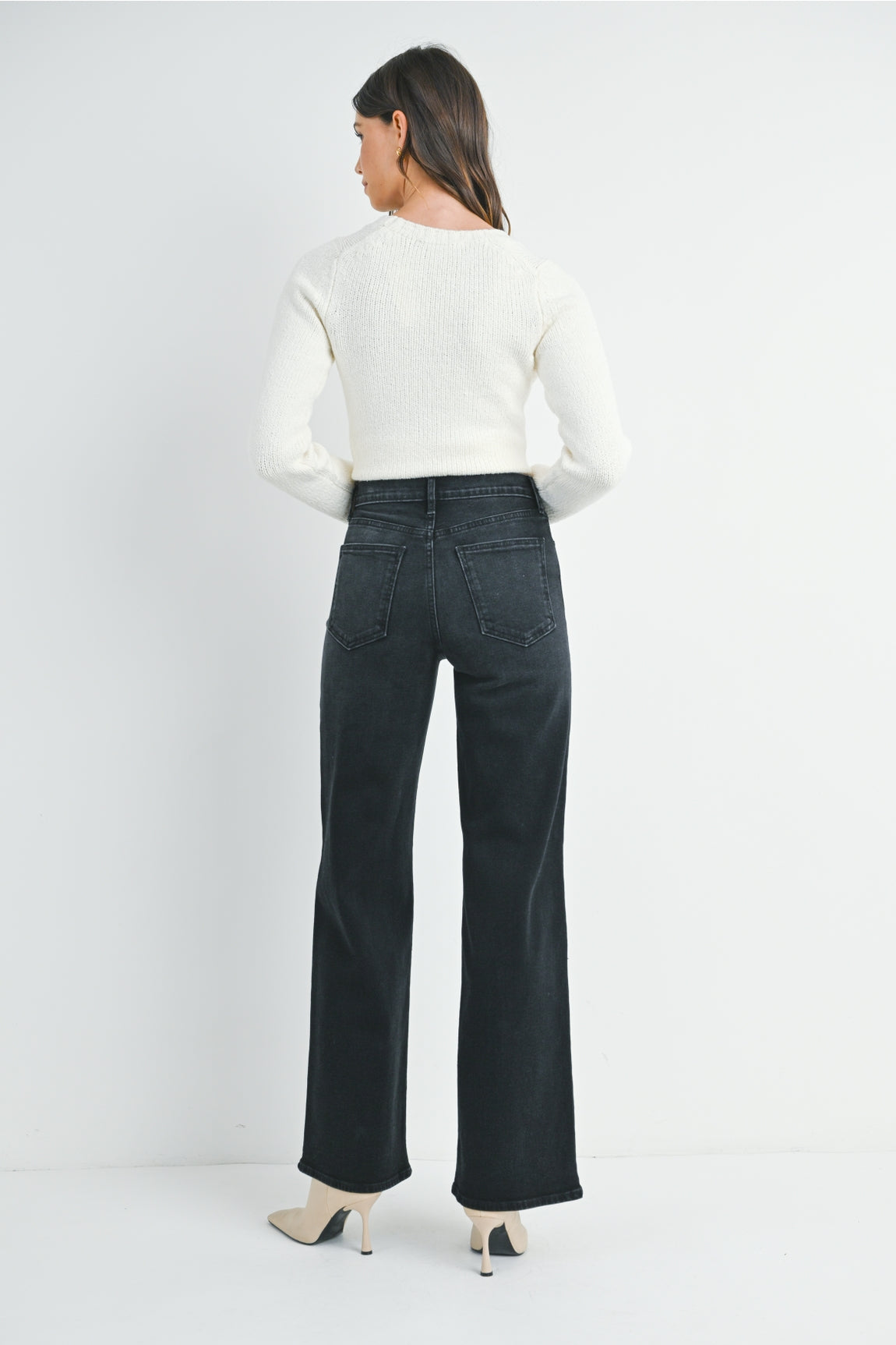 These washed black palazzo jeans bring effortless polish to any outfit. The high-rise waist and wide, drapey leg create a sleek, lengthening silhouette, while the soft washed finish adds a lived-in feel. The clean hem also makes them perfect for cuffing if you prefer a shorter or more relaxed look. Easy to dress up or down, they’re a versatile staple for every wardrobe.