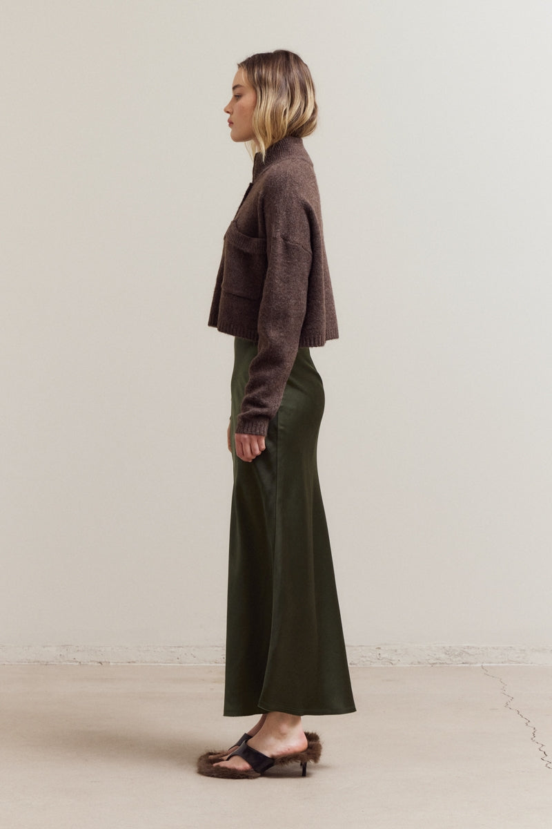 The silky satin finish adds a subtle sheen without feeling dressy, while the full maxi length offers warmth and coverage for the season. Pair it with a fitted knit, a slouchy sweater, or a simple long-sleeve tee for a look that feels elevated but never overdone.