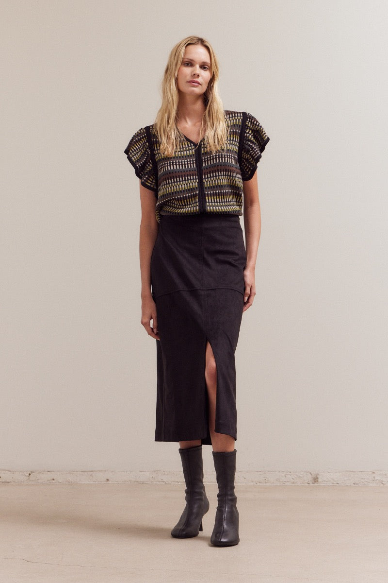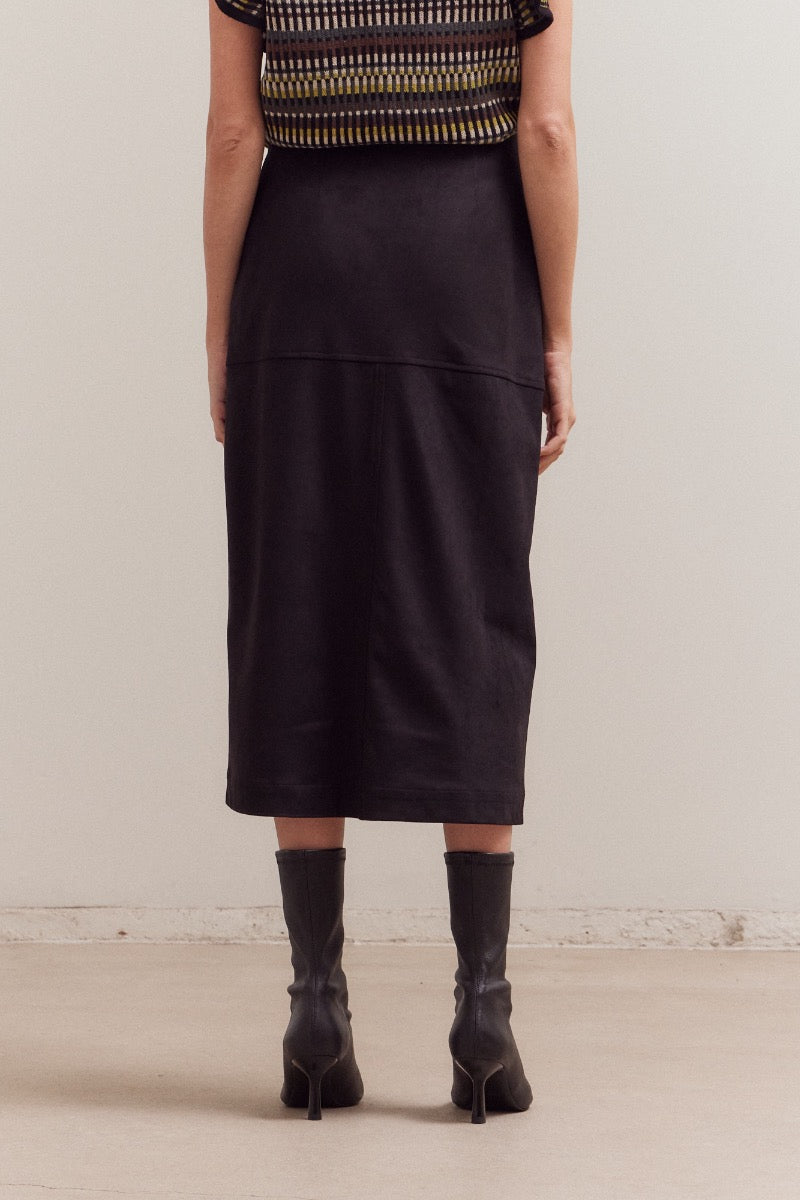 Chic, sleek, and endlessly versatile — the Sloan Pencil Skirt brings a modern edge to a timeless silhouette. Crafted from luxe vegan suede, this black pencil skirt offers a buttery-soft feel with a structured, flattering fit that moves with you. The high-waisted design elongates the figure, while the smooth finish adds just the right touch of sophistication.