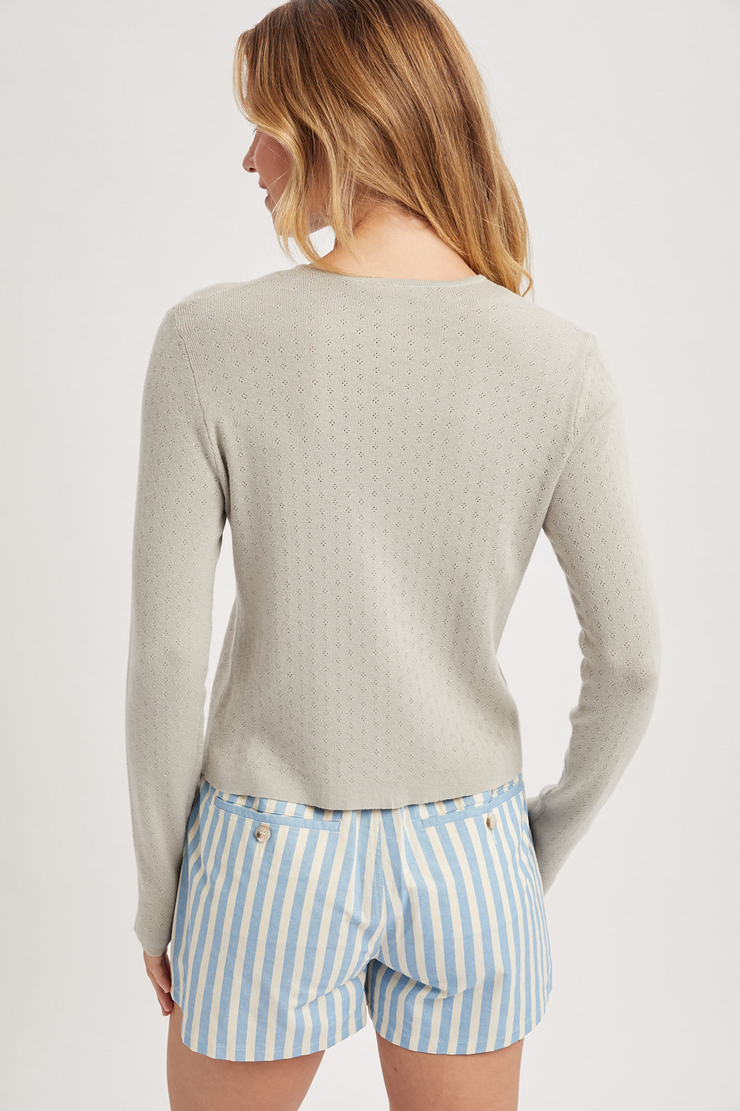 A timeless layer you’ll reach for all season long. The Everyday Pointelle Cardigan features a delicate knit pattern with subtle texture, a classic crew neckline, and a full button front for easy styling. Lightweight and breathable, it’s perfect worn on its own or layered over tanks and dresses. The flattering, slightly fitted shape makes it polished yet effortless — ideal for work, weekends, and everything in between.