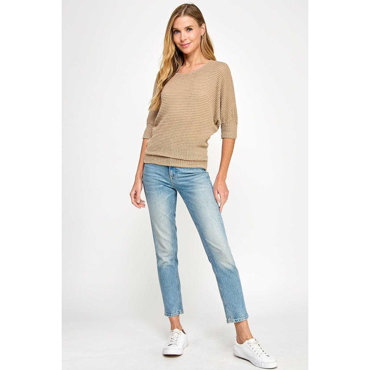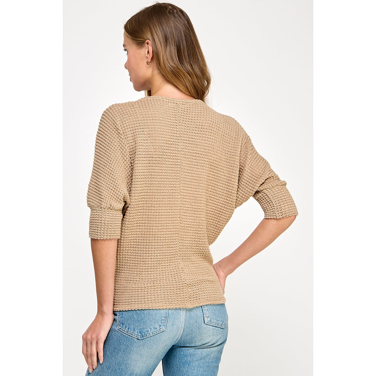 Soft, textured, and effortlessly elevated. This lightweight knit features a relaxed silhouette, flattering boat neckline, and easy 3/4 sleeves. The warm neutral tone makes it a versatile staple you can pair with denim, white jeans, or trousers.